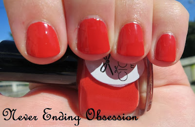 This is two coats of Brass Monkey over Rebel Fox. It is red/orange iridescent flakies in a clear base. This one had a better consistency but I think it could have had more flakies in it so that only one coat is needed.